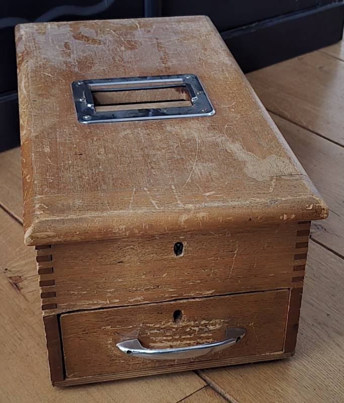 Mooie kassa lade met sleutel en klep.